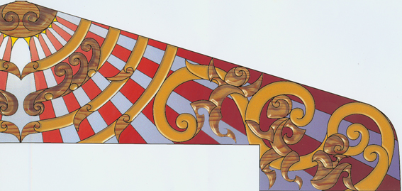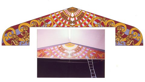 The mural was created using Totara native timber of New Zealand , custom board and enamel paints. Not all artwork could be used in this method but it demonstrates how the use of the computer can assist the process from concept to completion.
