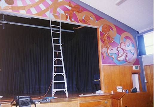 This work involved designing and constructing a mural over a large area that involved a stage. I had previously taken photos of the whole area and taken measurements. Once the design was completed it was scanned into the computer to work on creating a digital image.