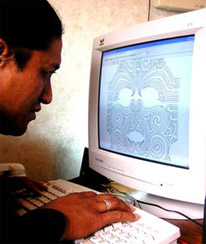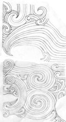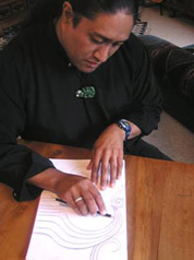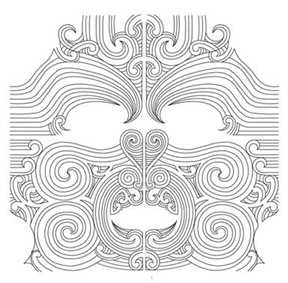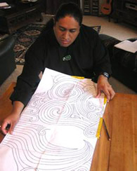 The following example shows how I created a painting of a Moko on canvas using the computer. The idea was to show two halves like a reflection showing the positive and the negative. Once the design was completed it was scanned into the computer. Then I was able to manipulate the lines for better control using design software.