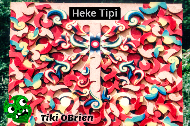 Located in Fairfield College Community Marae, Te Aratiatia, Hamilton are Heke tipi, made from particle board. Heke tipi are extentions to the Heke that run down the wall. Each piece is cut out forming three layers made up of thousands of small parts meticulously painted by hand and then laminated.